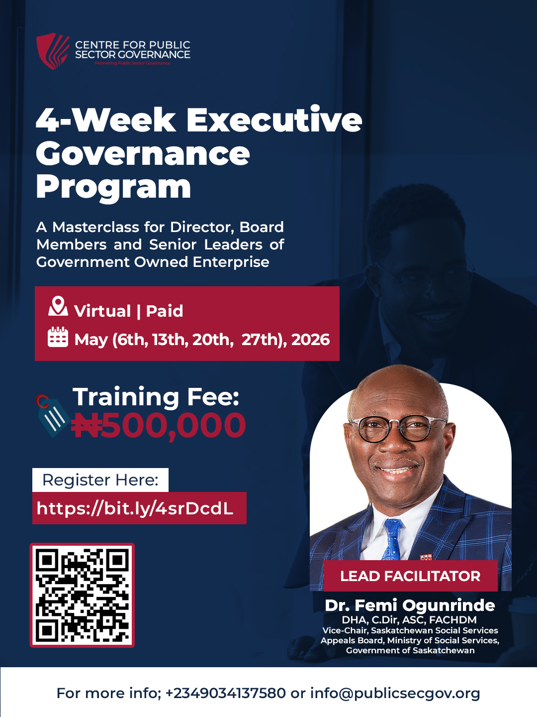 The CPSG 4-Week Executive Governance Program is a high-level introductory leadership masterclass designed for Directors, Chief Executives, Board Members, and senior public sector leaders across Nigeria. Organized by the Centre for Public Sector Governance (CPSG), the program goes beyond theory by combining expert instruction, practical institutional application, peer engagement, mentorship, and performance assessment.